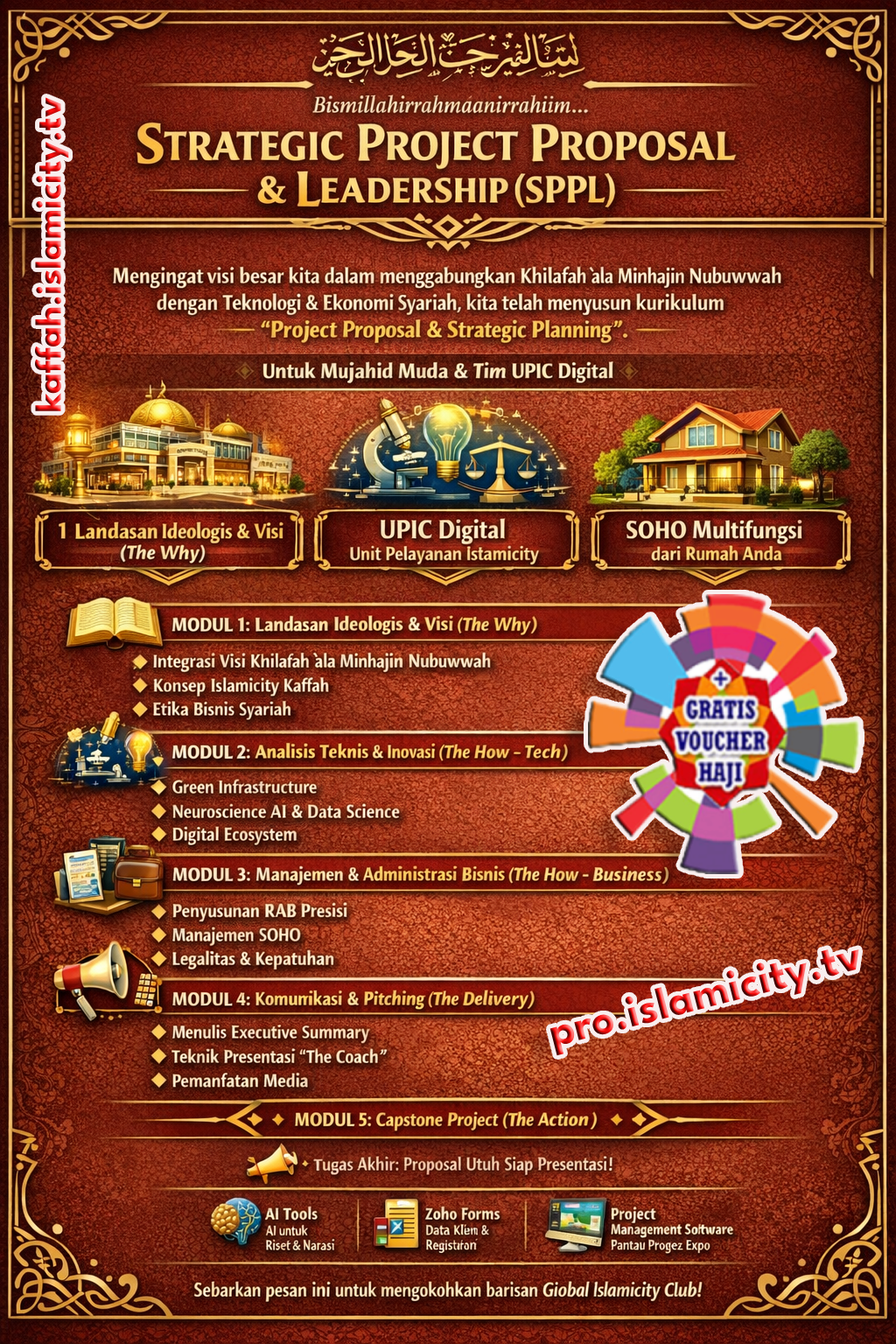 Bismillahirrahmaanirrahiim. Mengingat visi besar kita dalam menggabungkan Khilafah ‘ala Minhajin Nubuwwah dengan Tekonologi & Ekonomi Syariah, kita telah menyusun kurikulum “Project Proposal & Strategic Planning”.